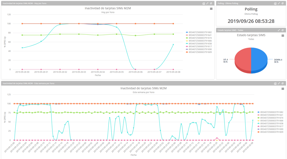 La plataforma M2M es capaz de monitorizar el estado de salud de un parque de tarjetas SIMs de una compañía. En tiempo real, permite identificar posibles problemas de comunicación, ya sea de una tarjeta individual o de alguna antena que provoque la falta de actividad de varias SIMs. La información de las tarjetas es correlacionada con los datos del negocio, aportando un valor añadido a la información de conectividad. Las SIMs se representan geolocalizadas en un mapa, permitiendo ver en todo momento su estado actual y su evolución en el tiempo. La plataforma M2M es compatible con todos los operadores de telefonía e integrable con los sistemas propios de gestión de alarma, calidad, seguridad, etc. de cada empresa.
