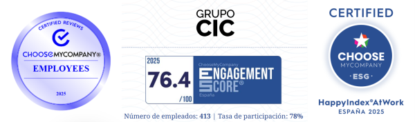 ChooseMyCompany evalúa y acredita anualmente a las empresas a través de diez certificaciones principales, entre las cuales ha seleccionado al Grupo CIC para las certificaciones HappyIndex®AtWork y TechAtWork® 2025, valorando el nivel de compromiso que se crea entre los empleados y sus organizaciones.