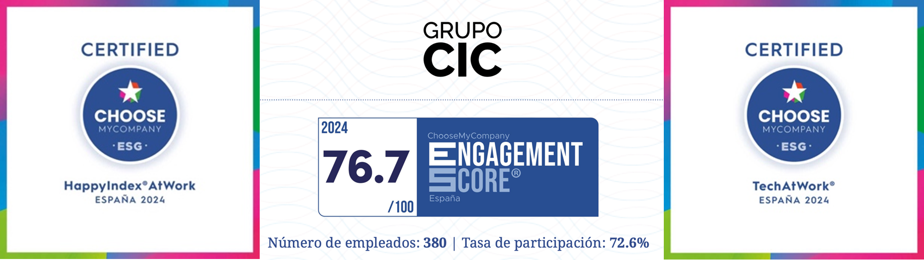 ChooseMyCompany evalúa y acredita anualmente a las empresas a través de diez certificaciones principales, entre las cuales ha seleccionado al Grupo CIC para las certificaciones HappyIndex®AtWork y TechAtWork® 2025, valorando el nivel de compromiso que se crea entre los empleados y sus organizaciones.