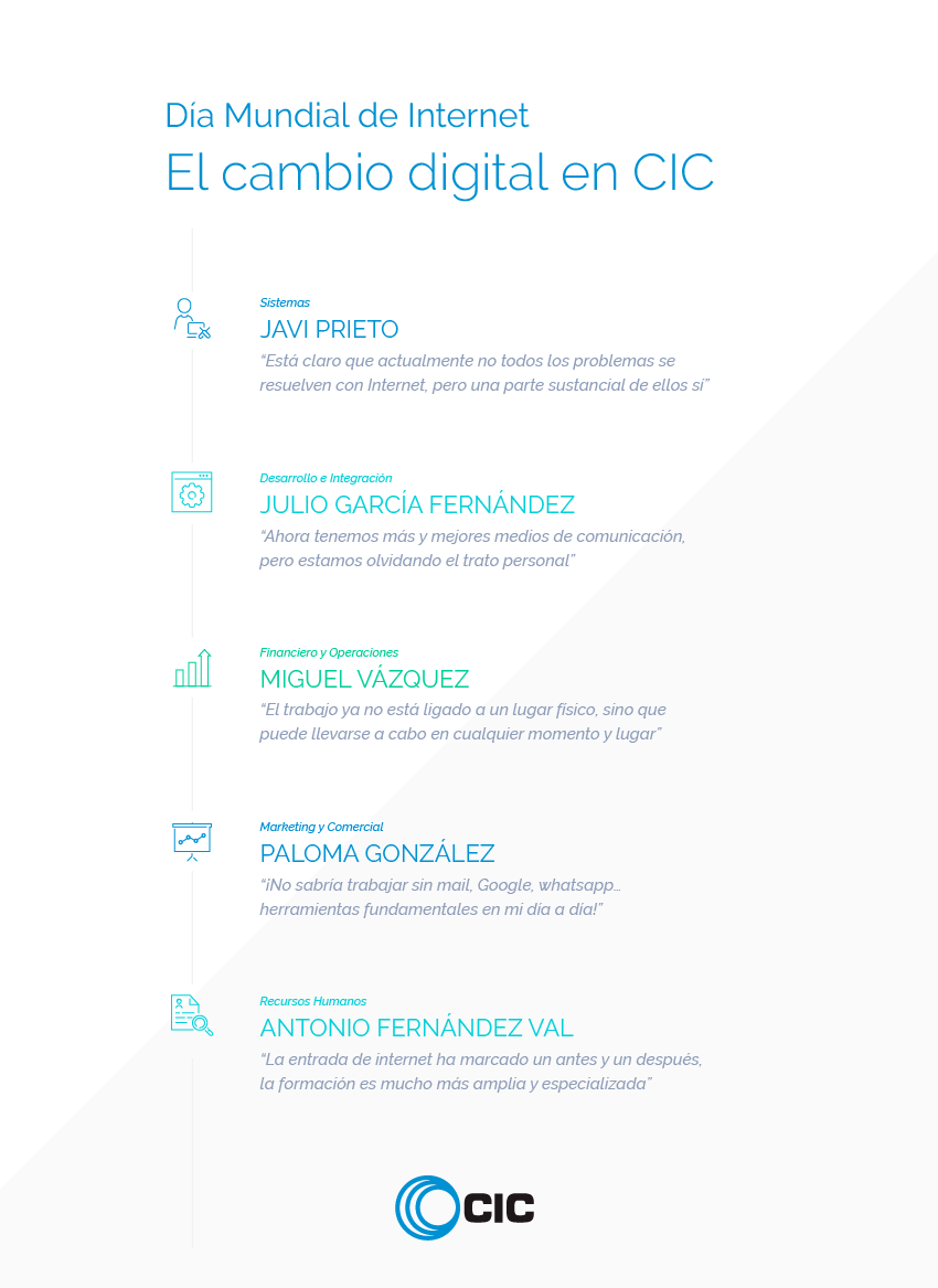 En CIC queremos celebrar el día mundial de Internet con varios testimonios de empleados que han vivido este cambio en sus diferentes puestos de trabajo. Para muchos de nuestros empleados, las nuevas tecnologías e Internet les han hecho reestructurar sus hábitos de trabajo.